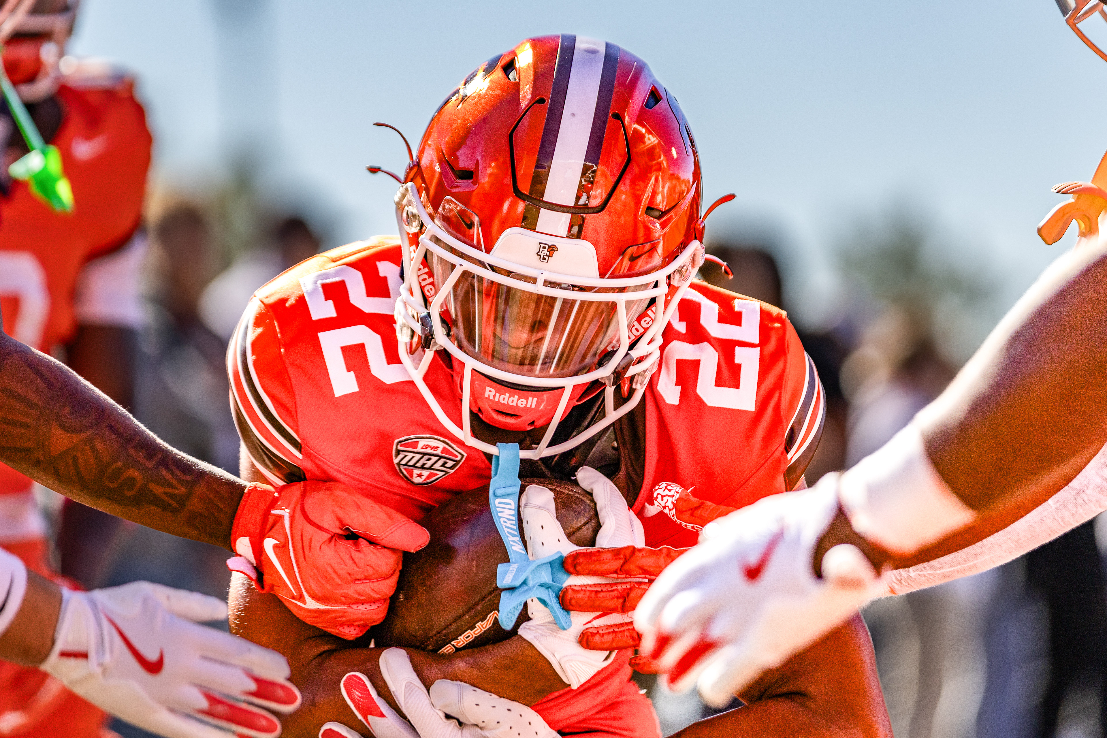 BOWLING GREEN, OH - Falcons sophomore running back Cameron Pettaway (26) screams after crossing the goal-line during the Battle of I-75 against the Toledo Rockets at Doyt L. Perry Stadium in Bowling Green, Ohio.